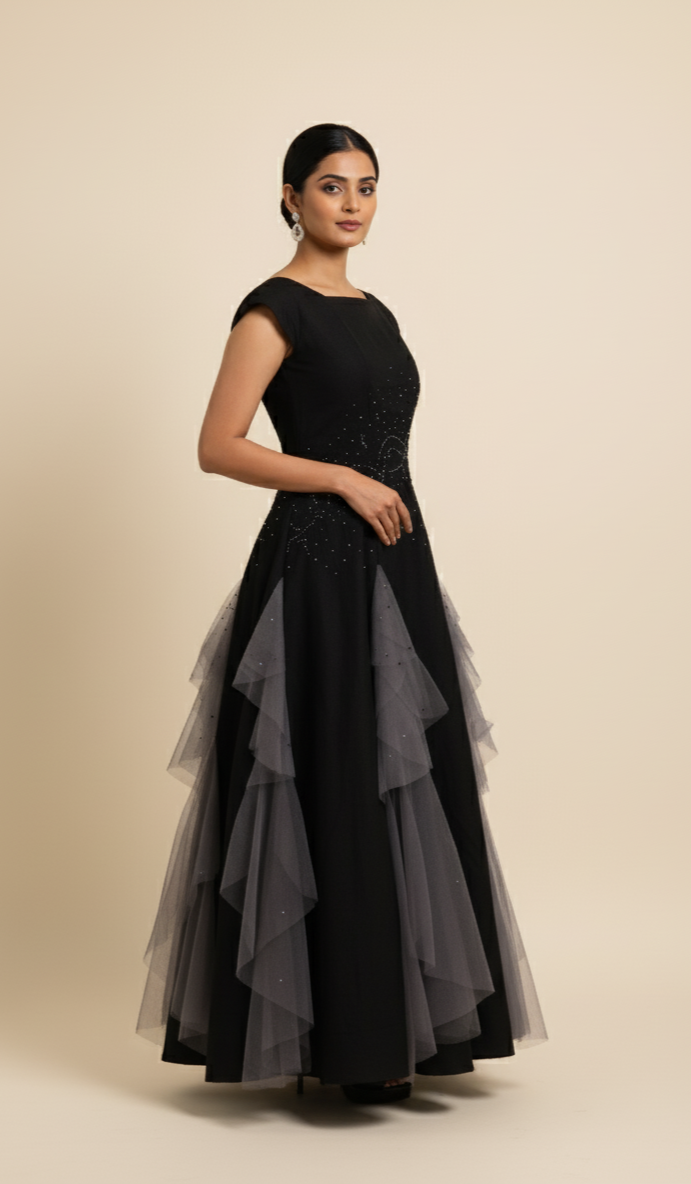 Black A- line frock with perfectly stiched bodies adding the tule layers at the sides and beaded waistline which gives you confidence and comfort with the elastic back .