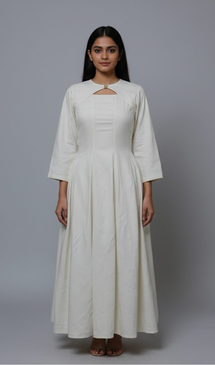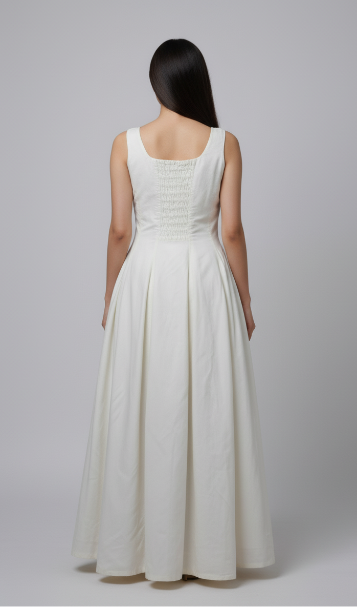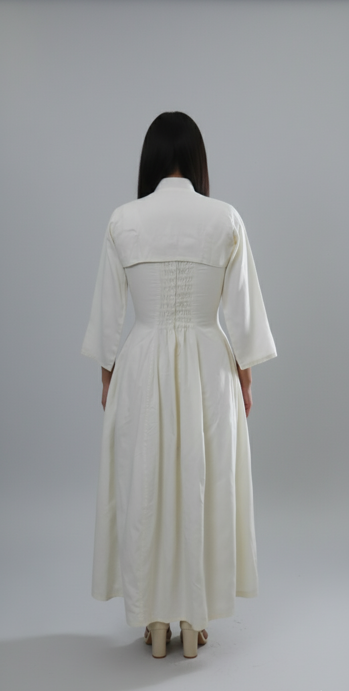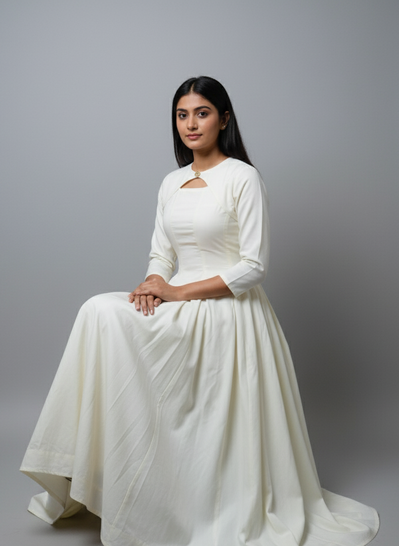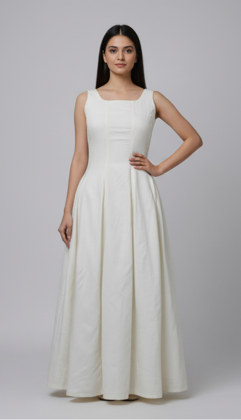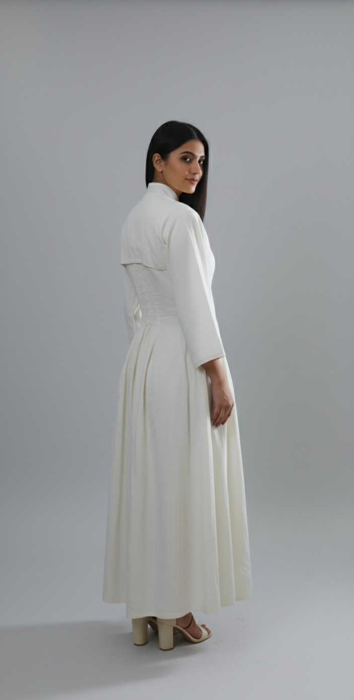 Step into grace with Frosted Pearl, a minimal yet striking white A- line dress that blends classic tailoring with modern femininity. Designed to celebrate simplicty , this piece flows gently over your curves, offering both comfort and poise with elastic and zipper in the back And also has pockets.