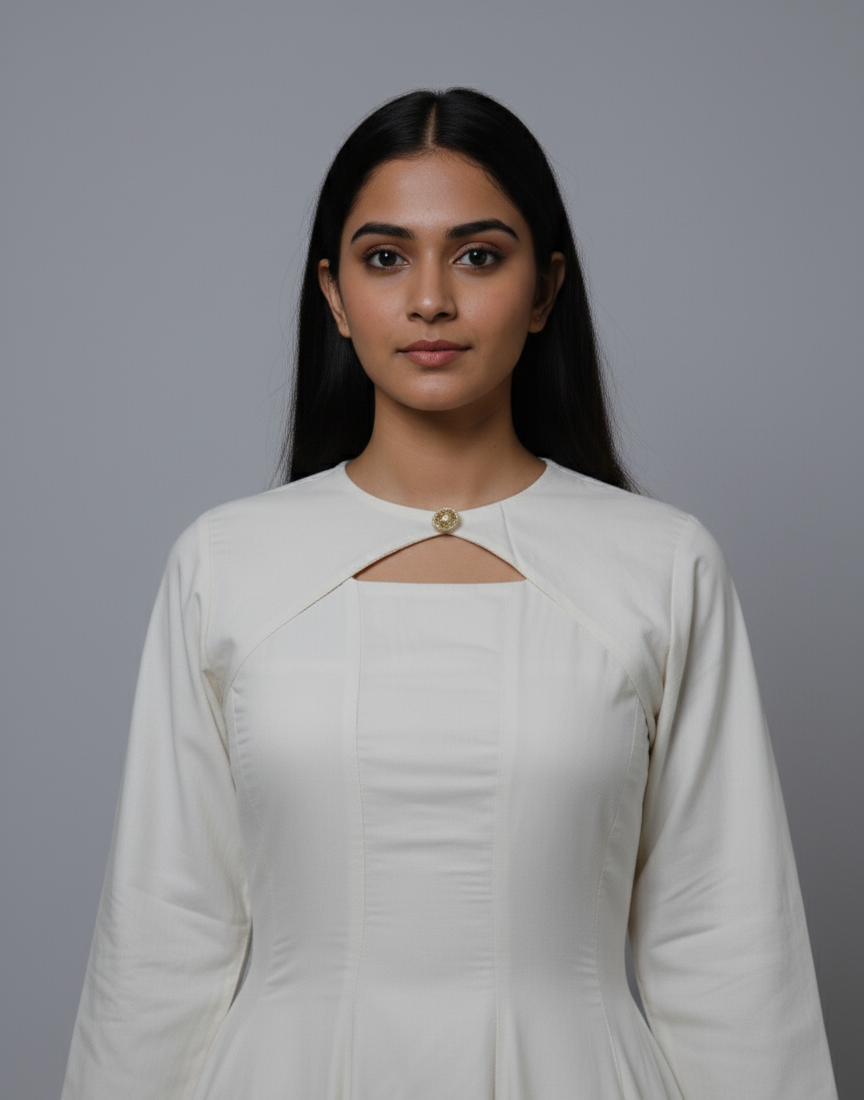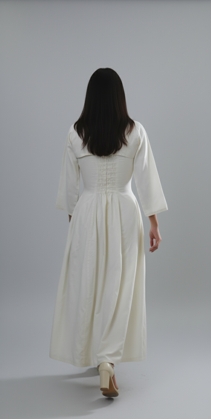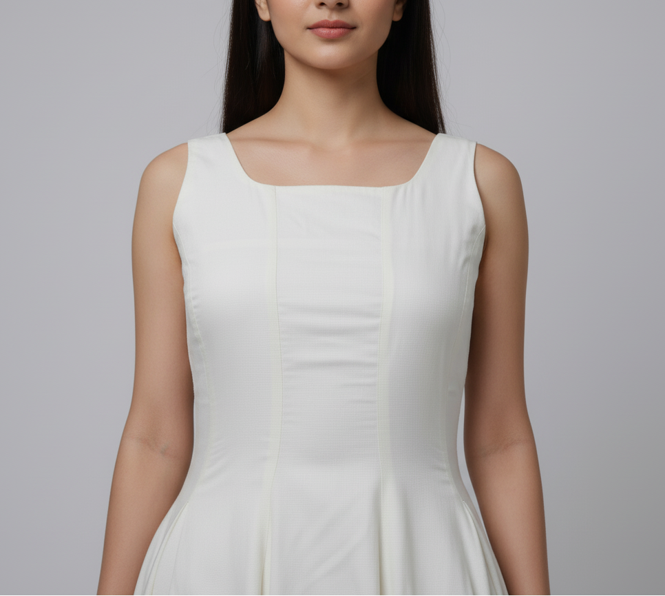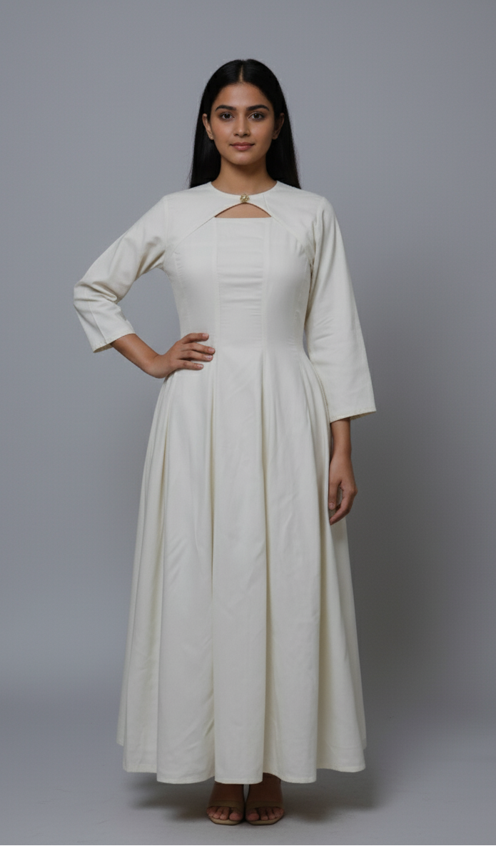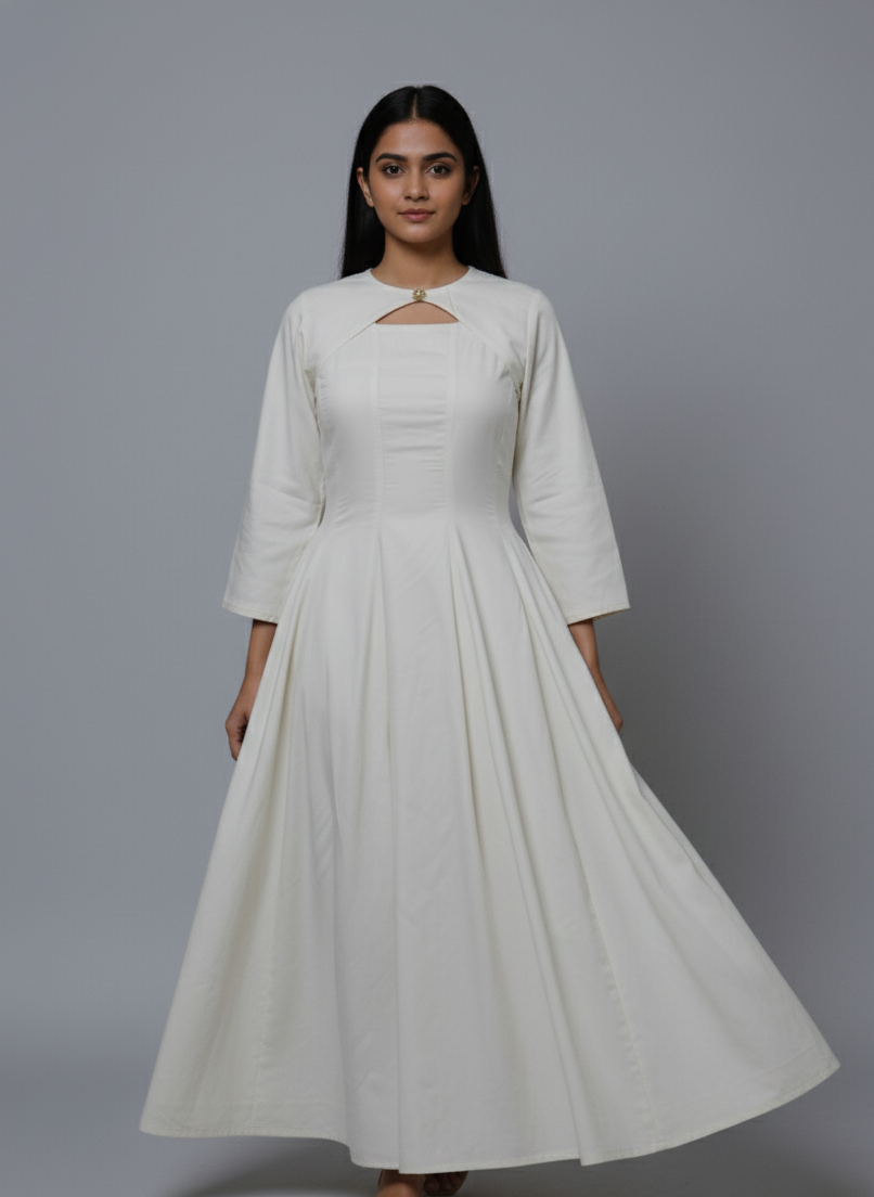 Step into grace with Frosted Pearl, a minimal yet striking white A- line dress that blends classic tailoring with modern femininity. Designed to celebrate simplicty , this piece flows gently over your curves, offering both comfort and poise with elastic and zipper in the back And also has pockets.