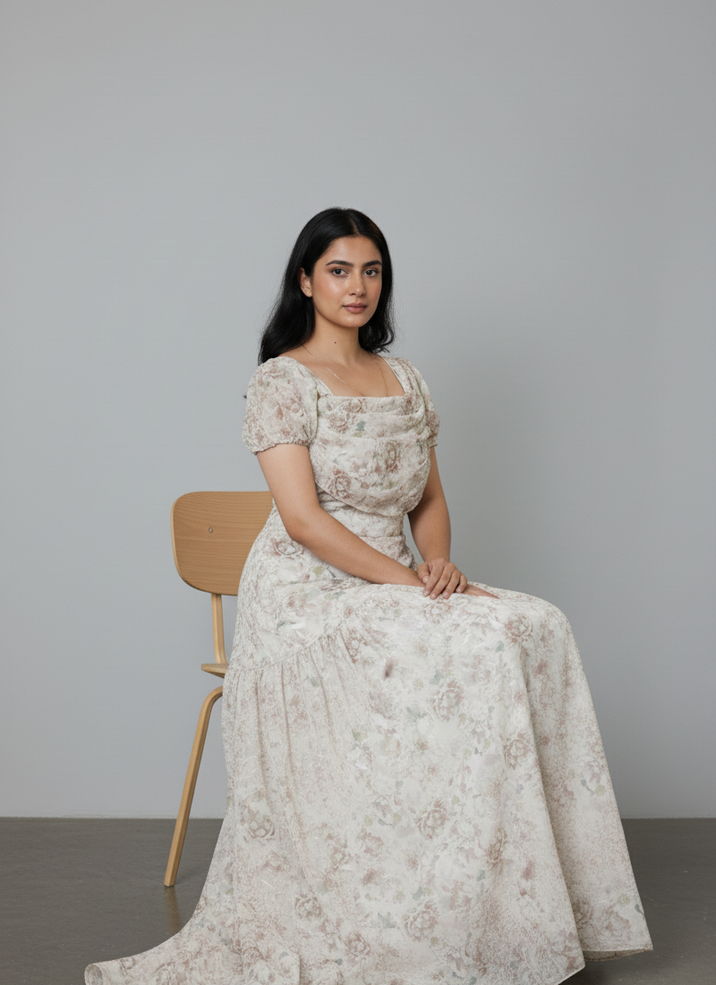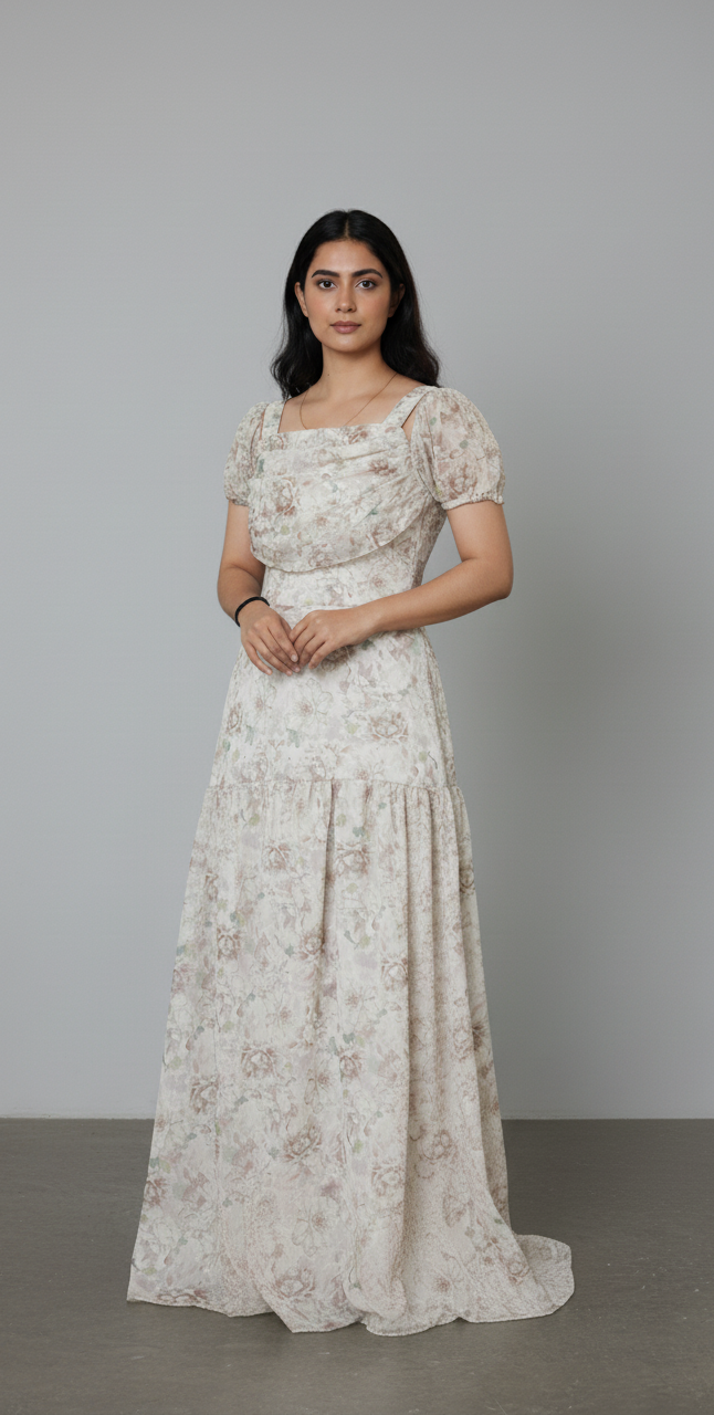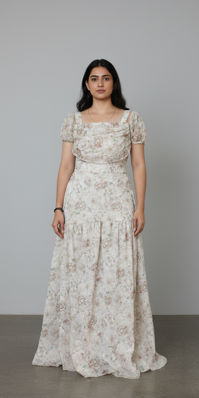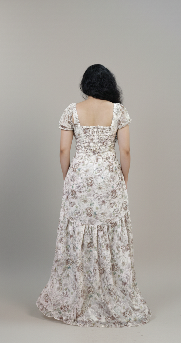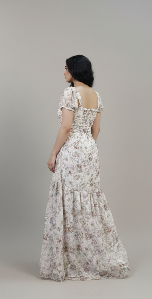 A mermaid cut maxi frock with adjustable off sleeves and elastic with zipper at the back and layers draped front with princess seams give you the cottage core lady vibes in fairy tales✨