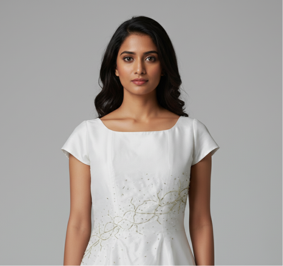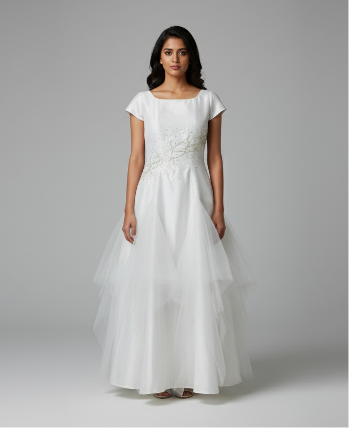 White A- line frock with perfectly stitched bodies adding the tule layers at the sides and beaded waistline which gives you confidence and comfort with the elastic White.